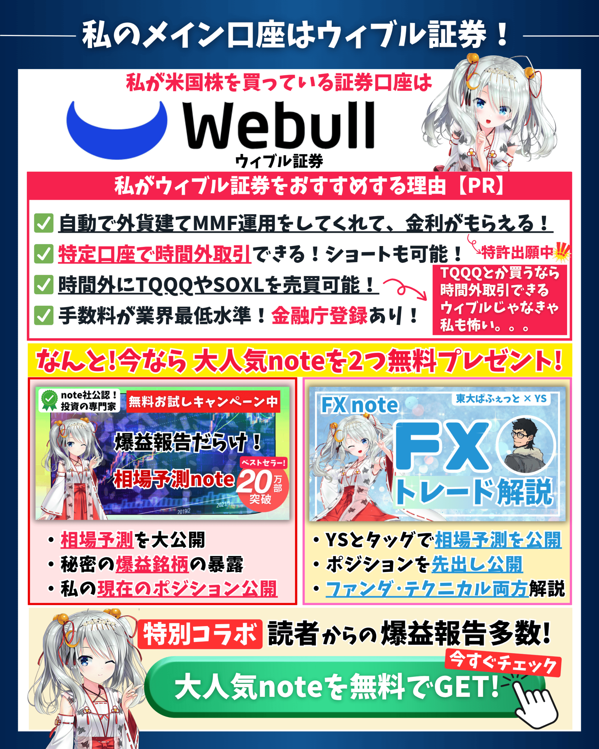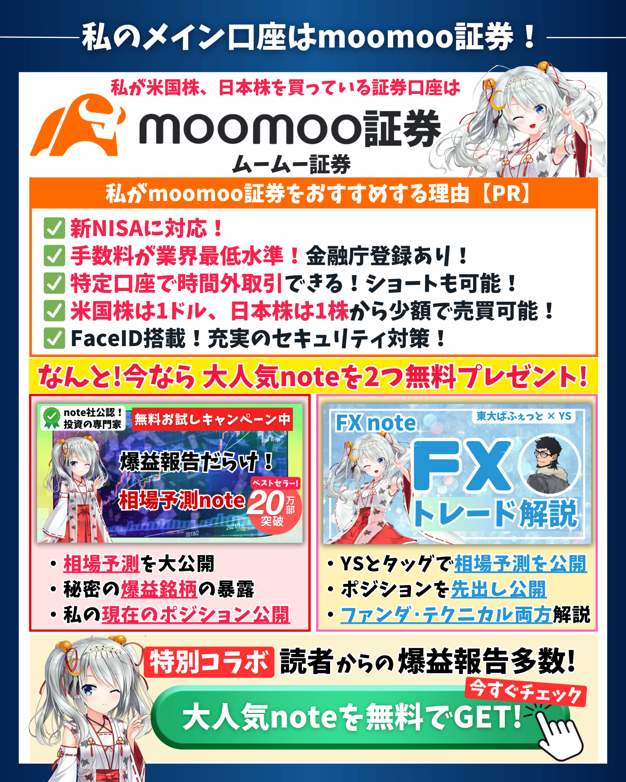 そして、まず皆さんに相場予測noteを読んで爆益を手にしてもらいたいという思いから、現在、ウィブル証券moomoo証券とのキャンペーンにより相場予測noteの初月無料プレゼントを実施しています。次の項目で説明しています。