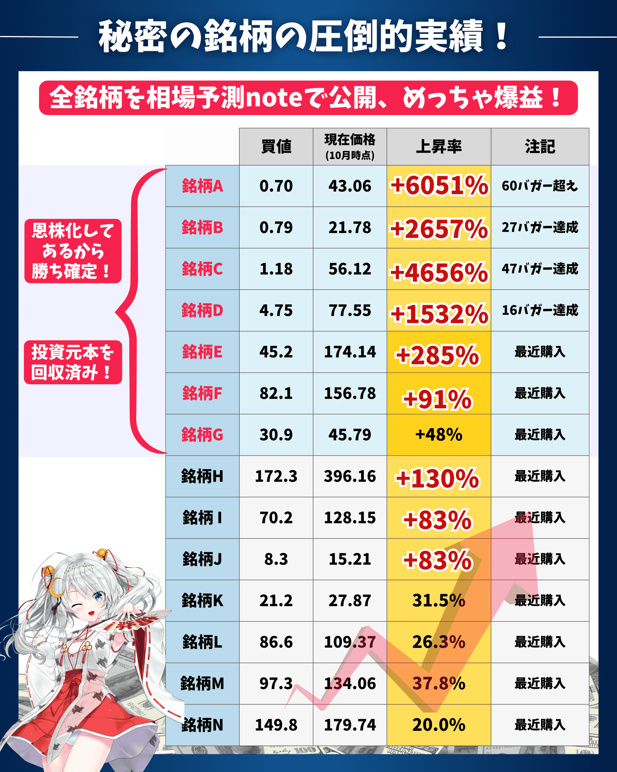 事前に仕込んでいた秘密の個別銘柄達が爆益を出し続け資産が急増しています。中には50倍になっている銘柄も存在しています。
