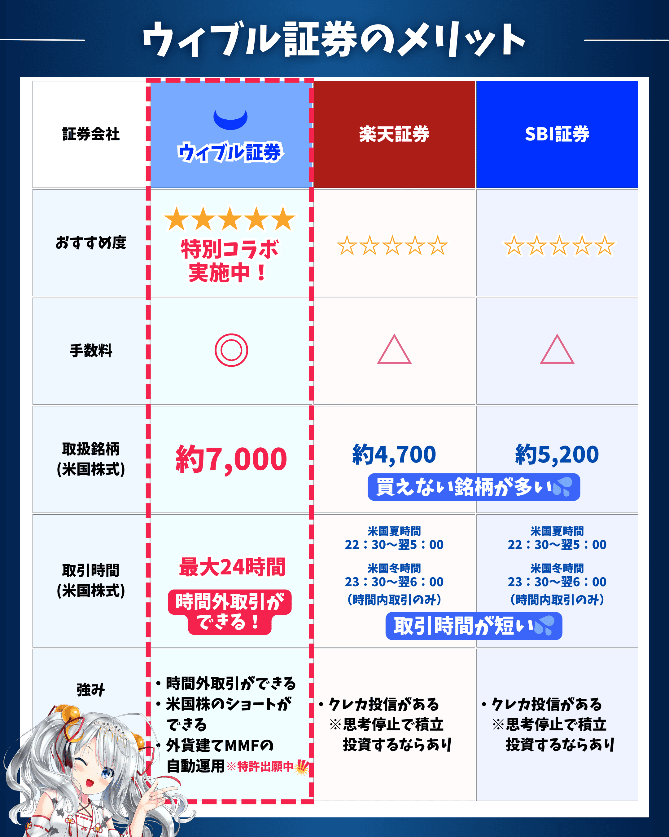楽天SBIと比べて、以下の点においてウィブル証券とmoomoo証券が優れているので、この2つがメイン口座なのは確定です。