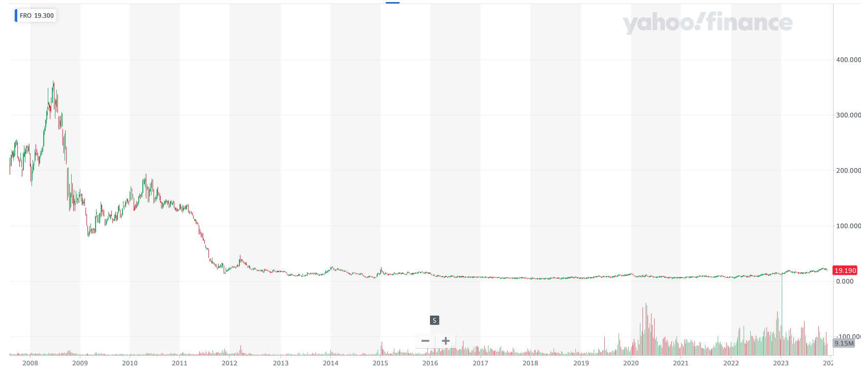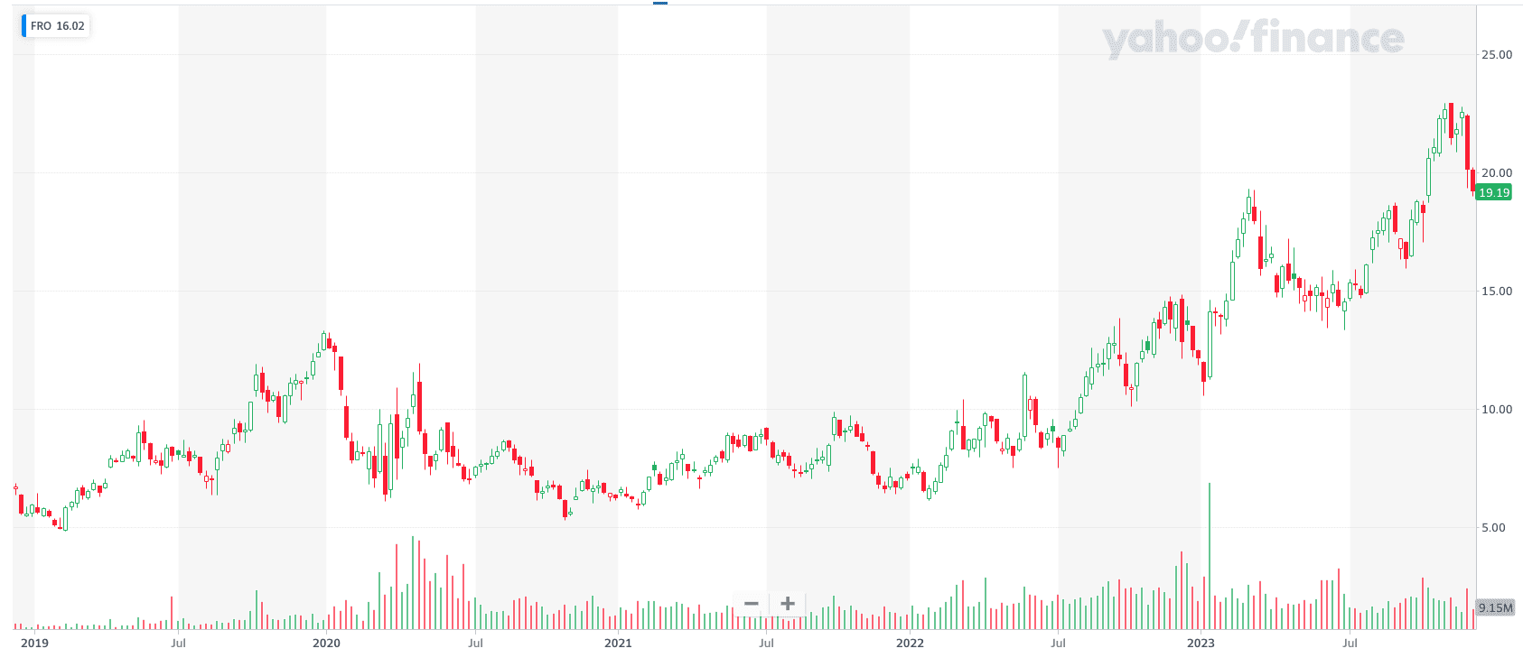 輸送量の回復に伴いタンカー株も回復し、多くの銘柄が倍以上に上昇していますがまだまだ上値余地は高いです。以下は直近5年のFROの株価推移です。