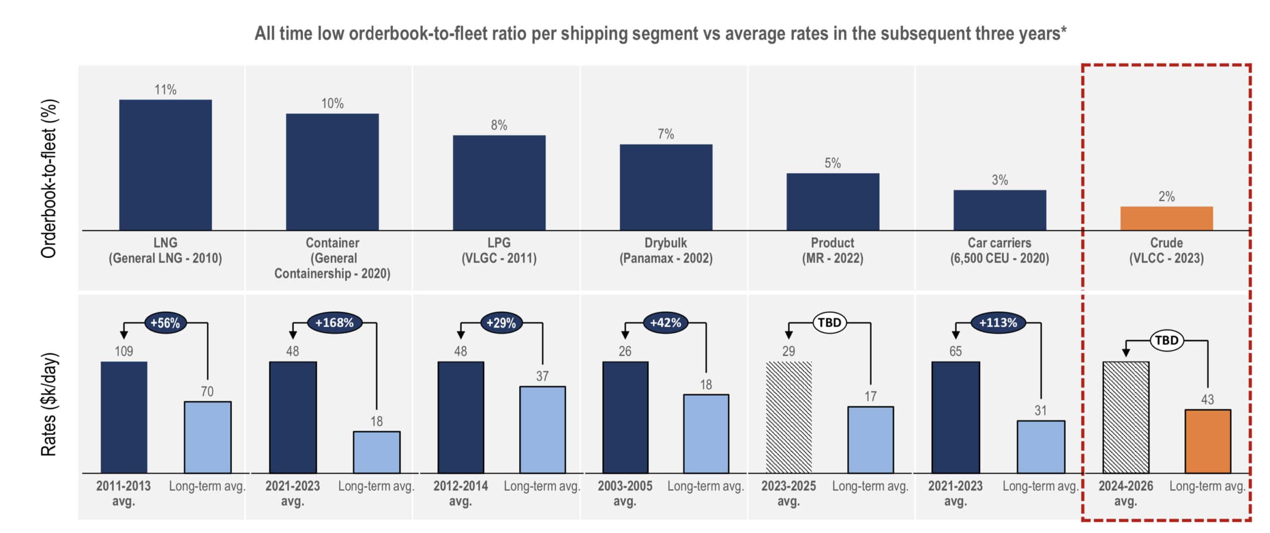 さらに、約54隻のVLCCが老朽化により顧客基準に適合しなくなるため、VLCC換算で129隻の不足が見込まれます。