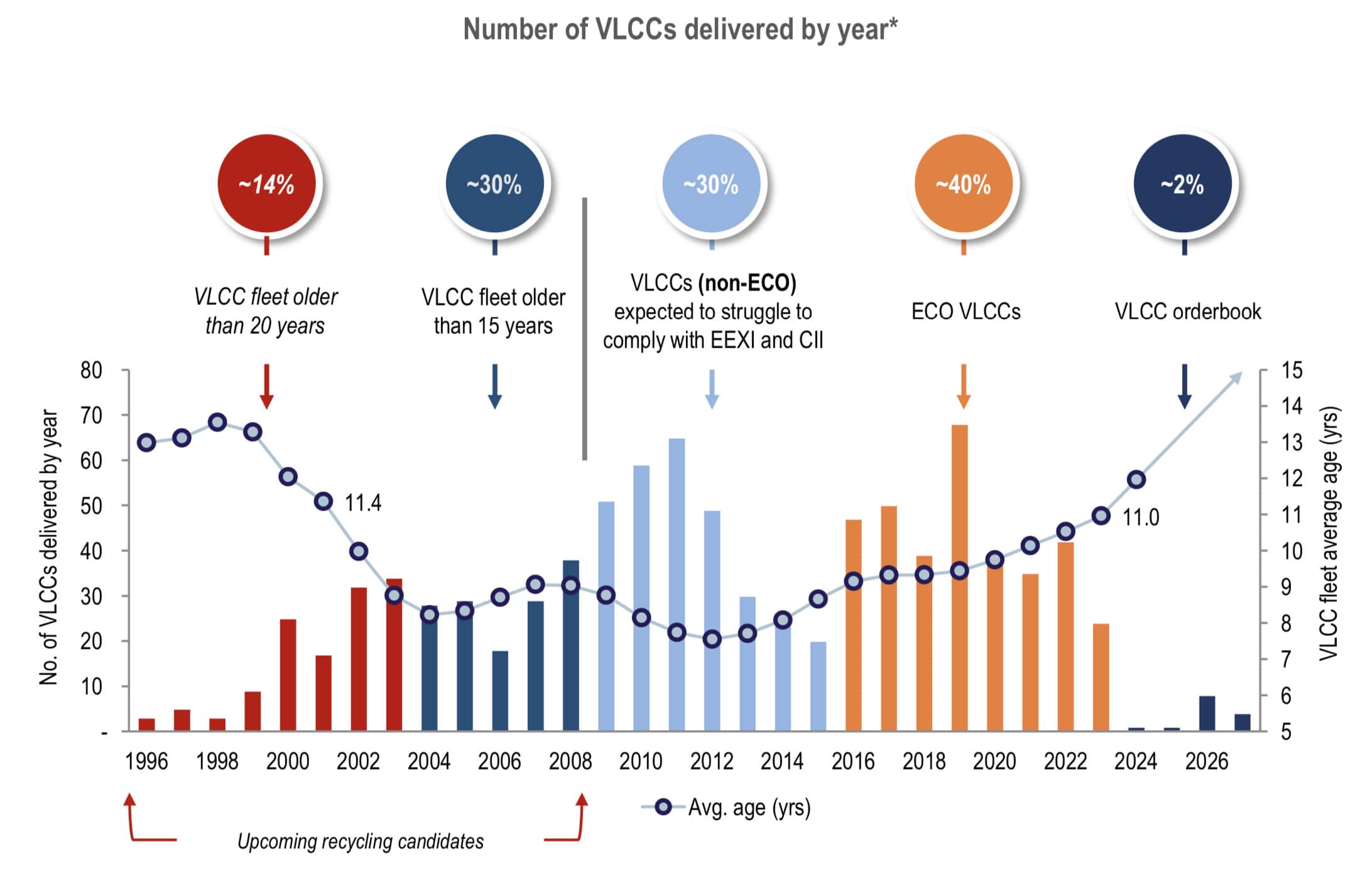 タンカー市場では船齢20年以上のVLCCは108隻で、世界の船隊の約12%にあたります。今後3年間で、さらに73隻(8%)が寿命を迎えます。