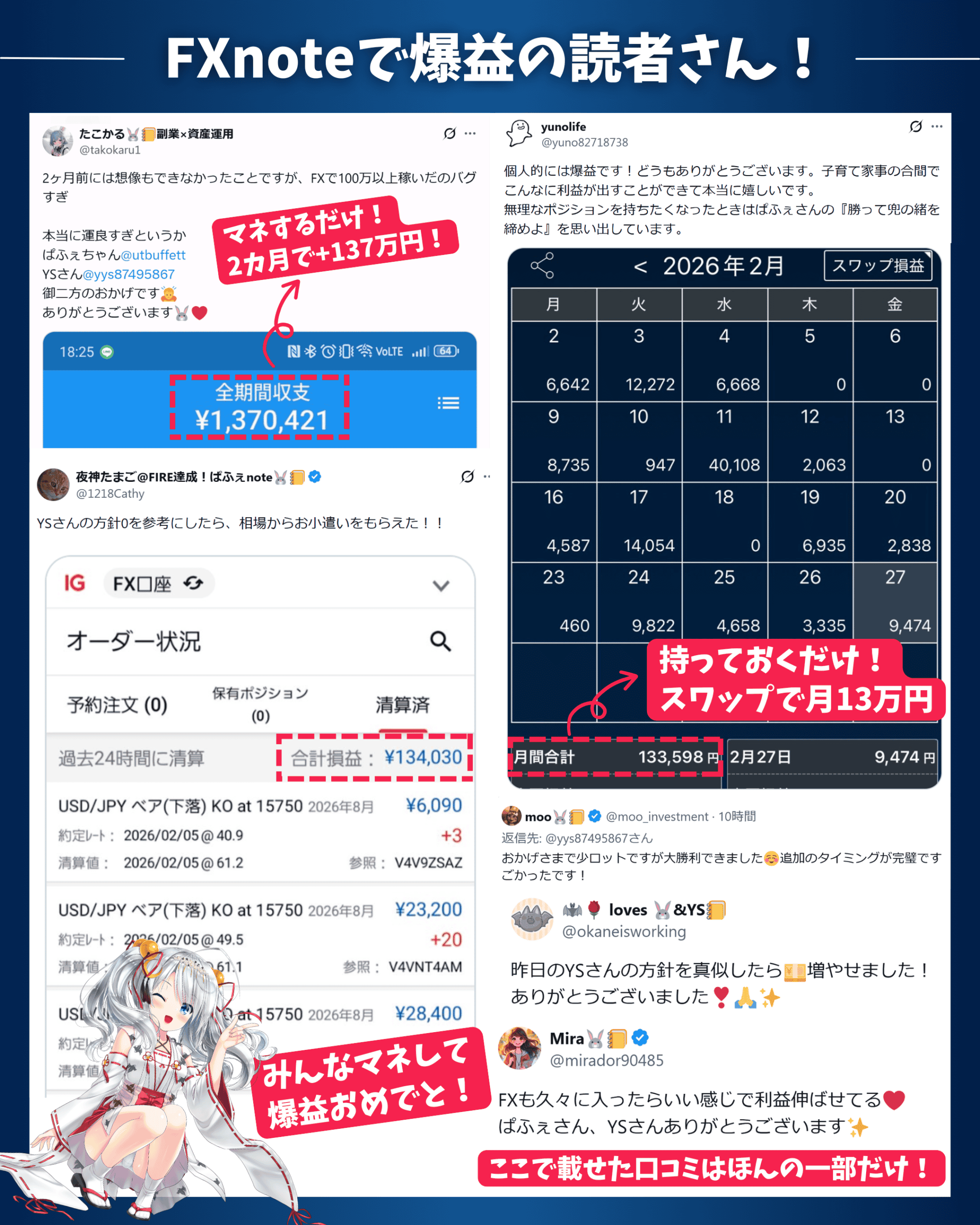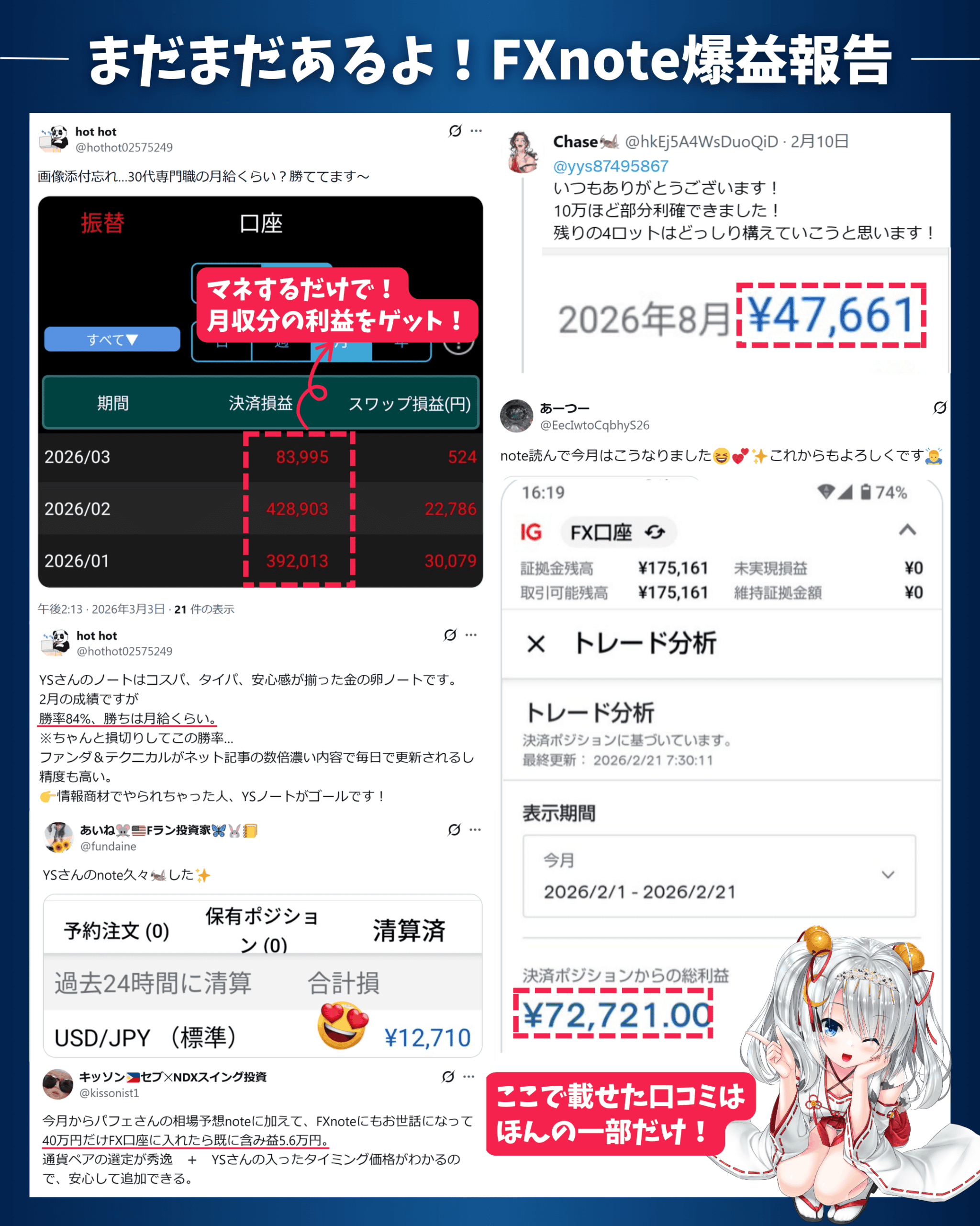 常に爆益報告やnoteに関する賞賛の声を頂けていて、執筆するモチベーションを保つことができています。