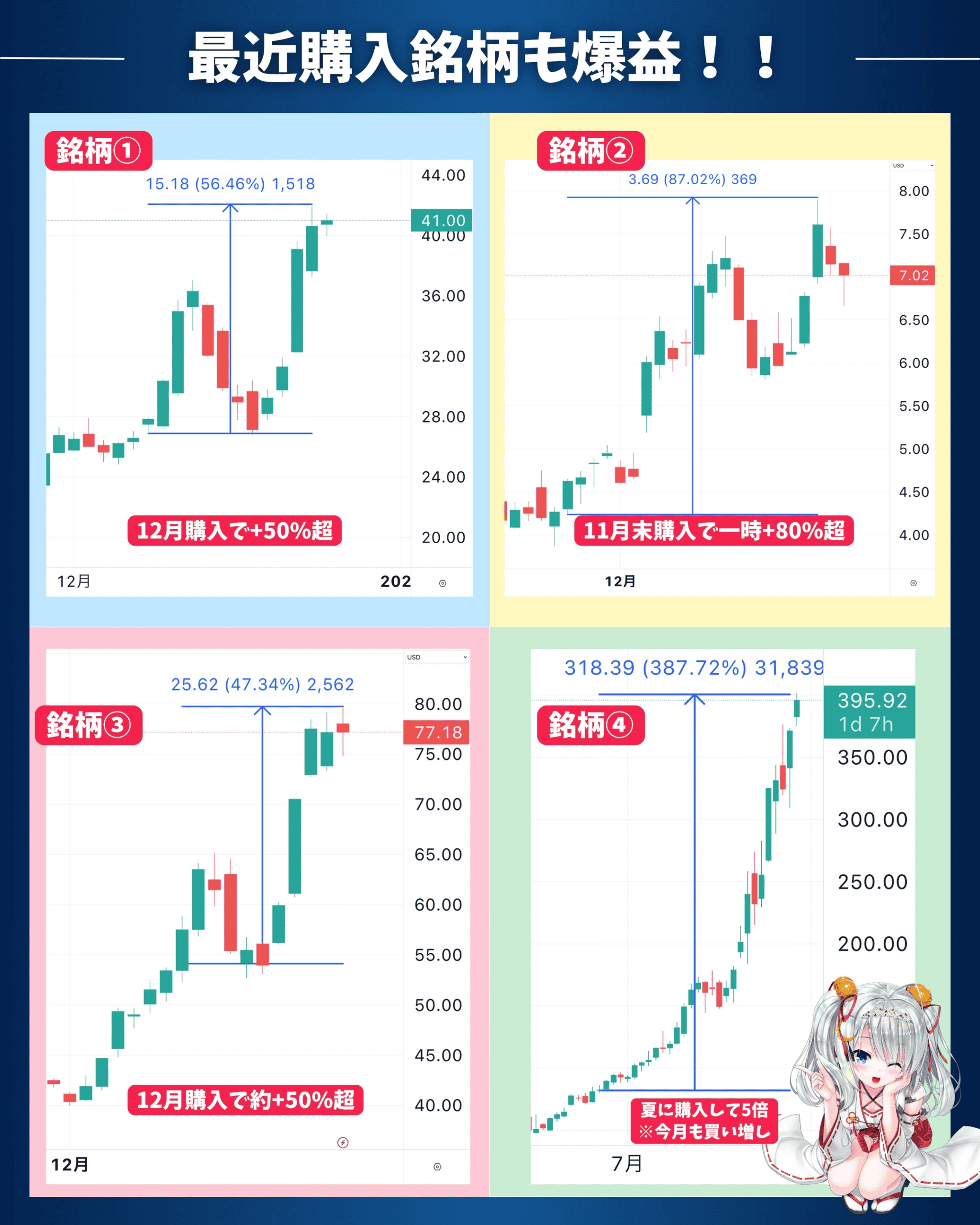 直近数ヶ月で仕込んだ銘柄も 4倍近くに上昇している銘柄もあります!