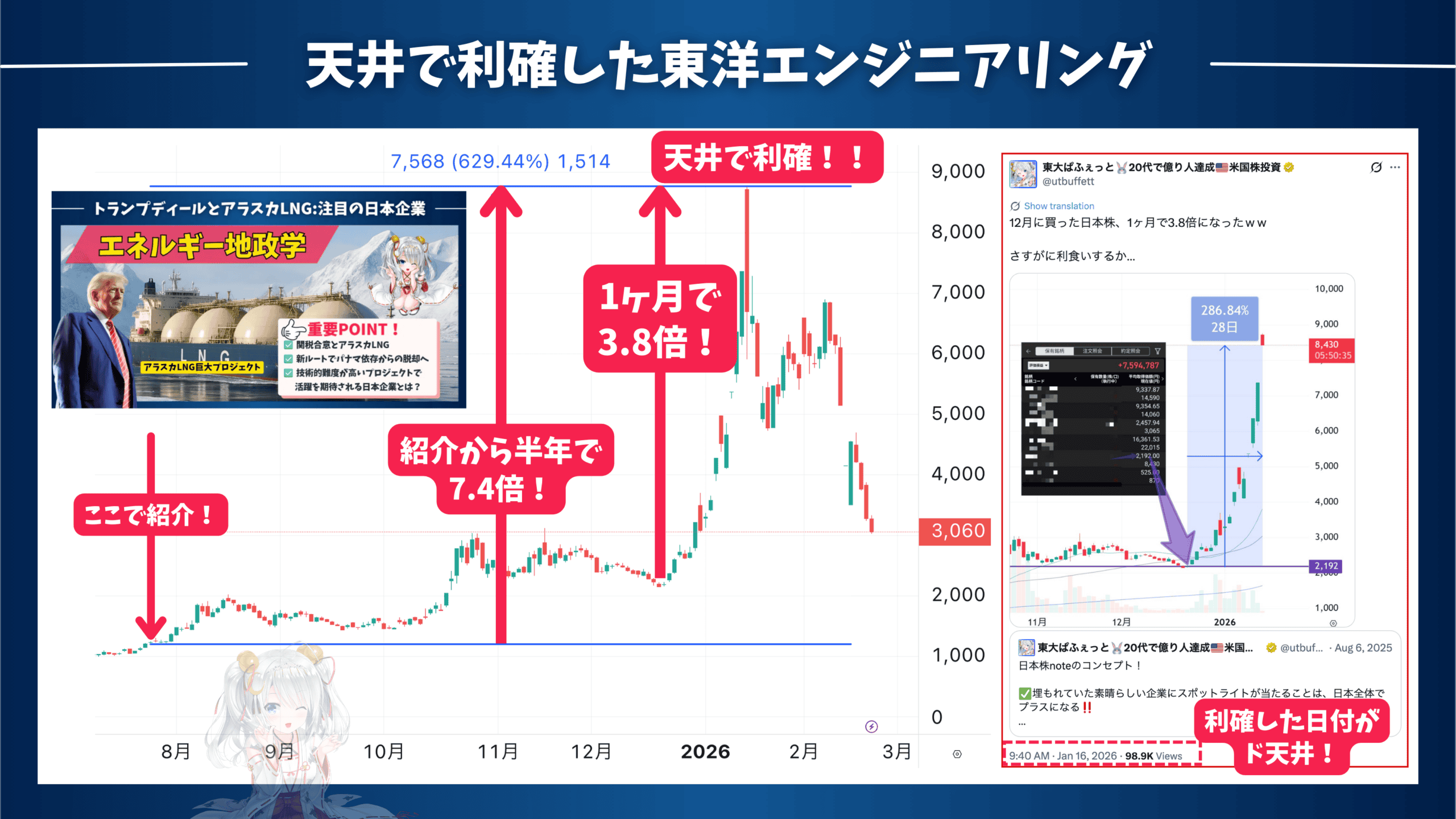 購入だけでなく利確も天井で行えています!以下は利確済みの東洋エンジニアリングの例です!