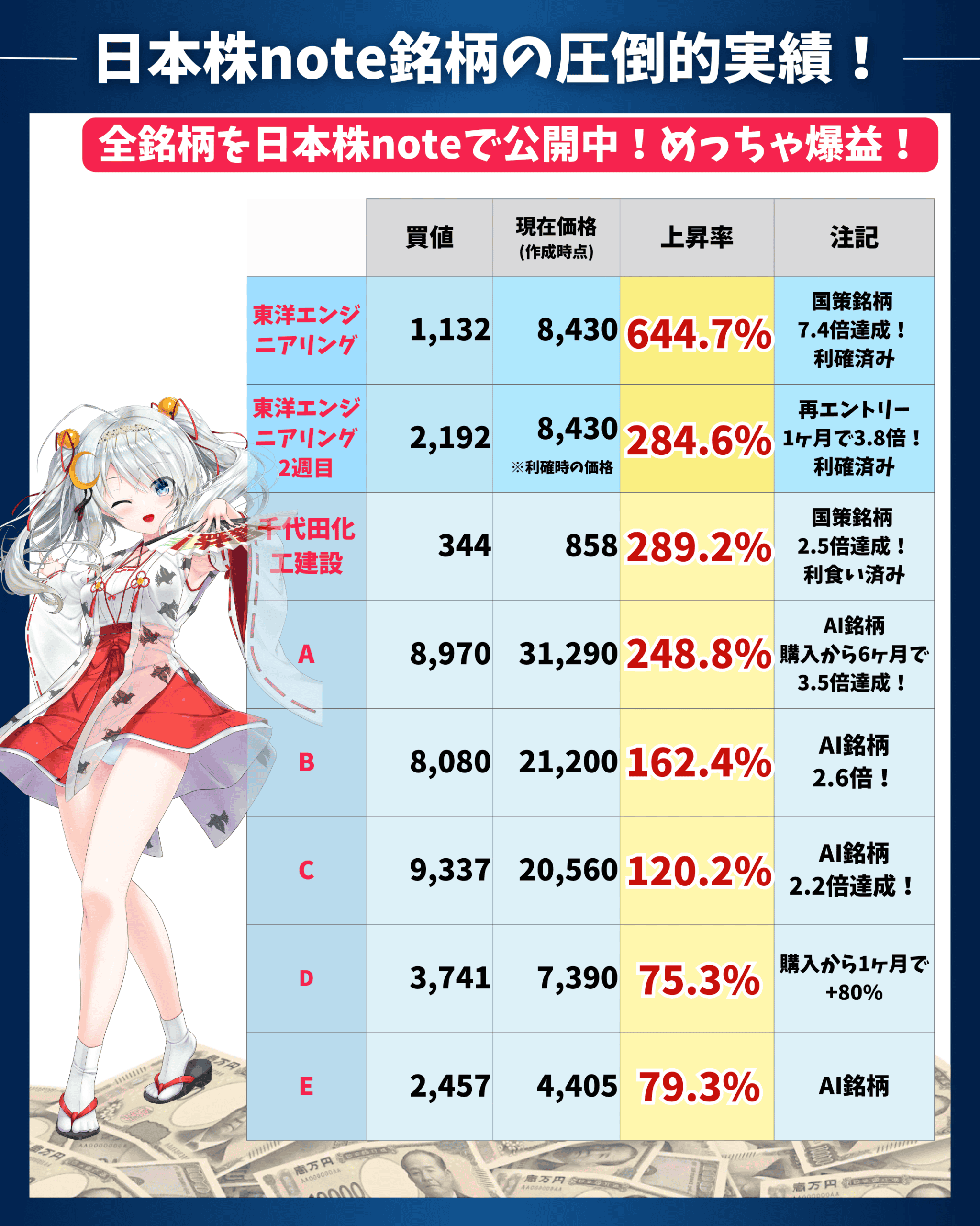 そして、開始から半年が経過して絶好調なのが日本株noteです。既に利確した銘柄を含めて以下の実績を残しています。