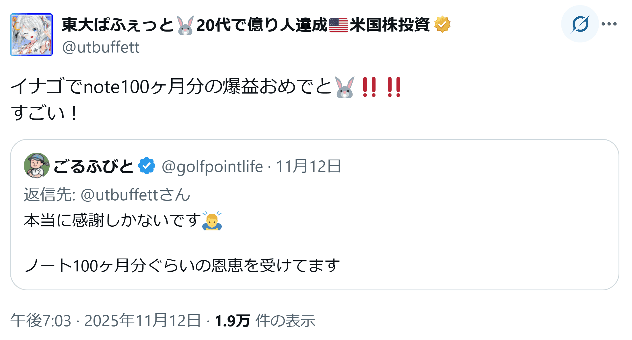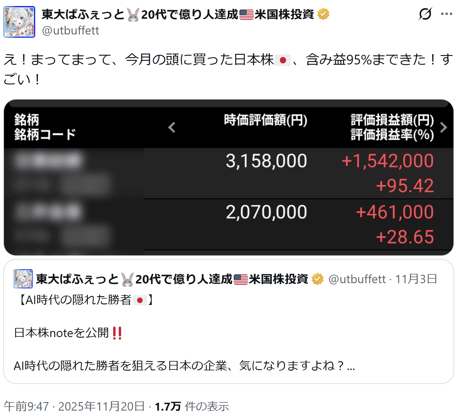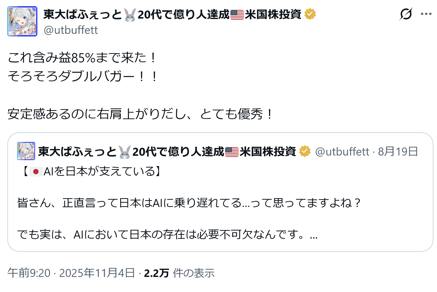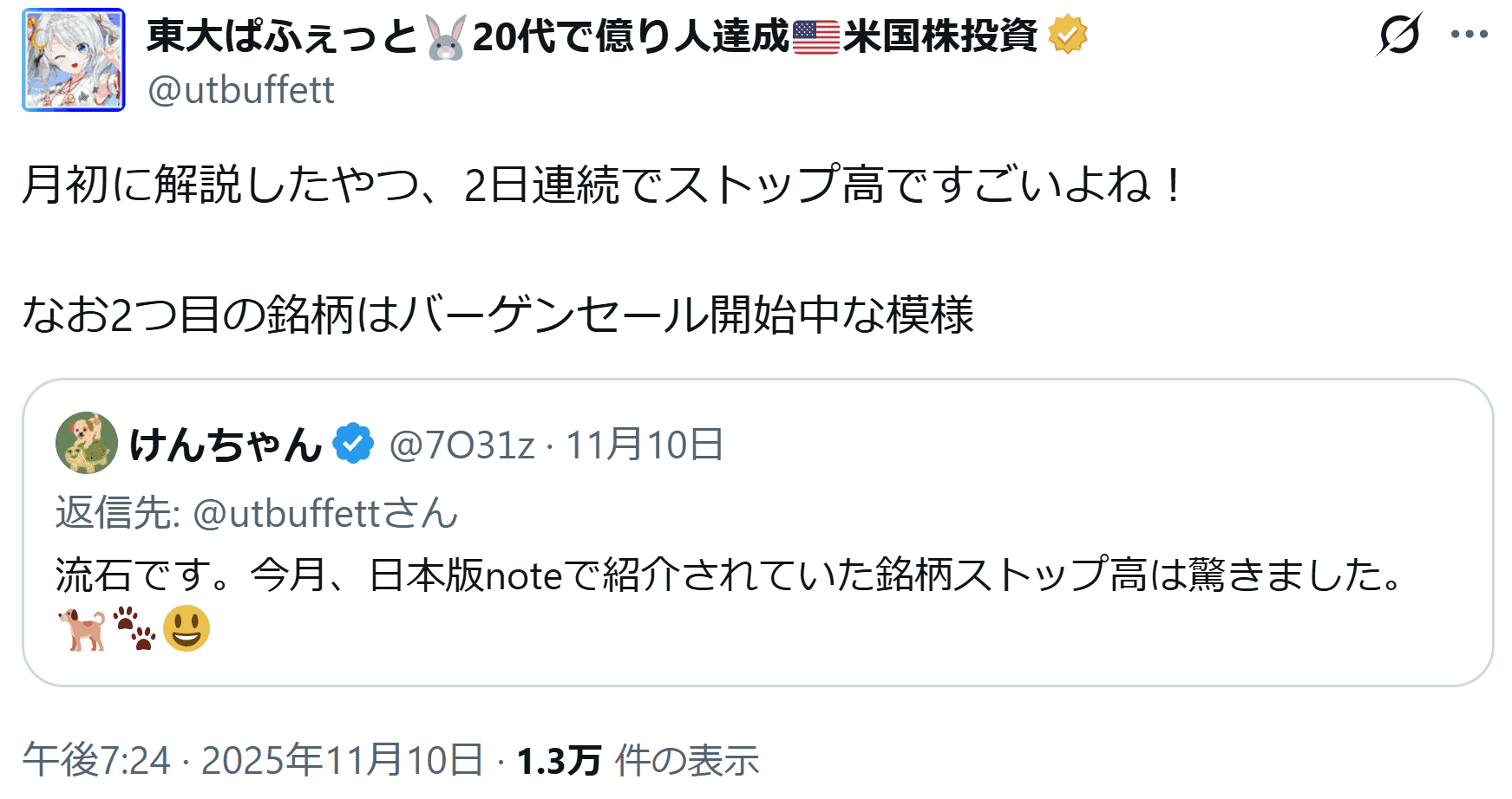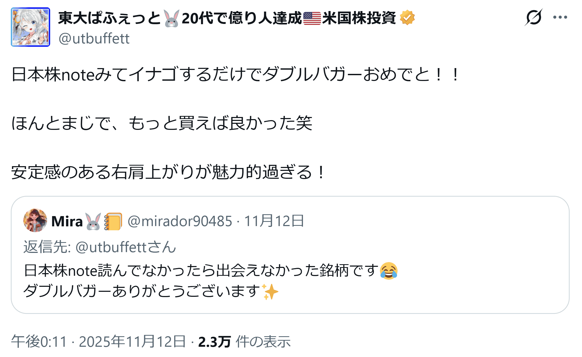 日本株noteで紹介した銘柄がダブルバガー達成🐰