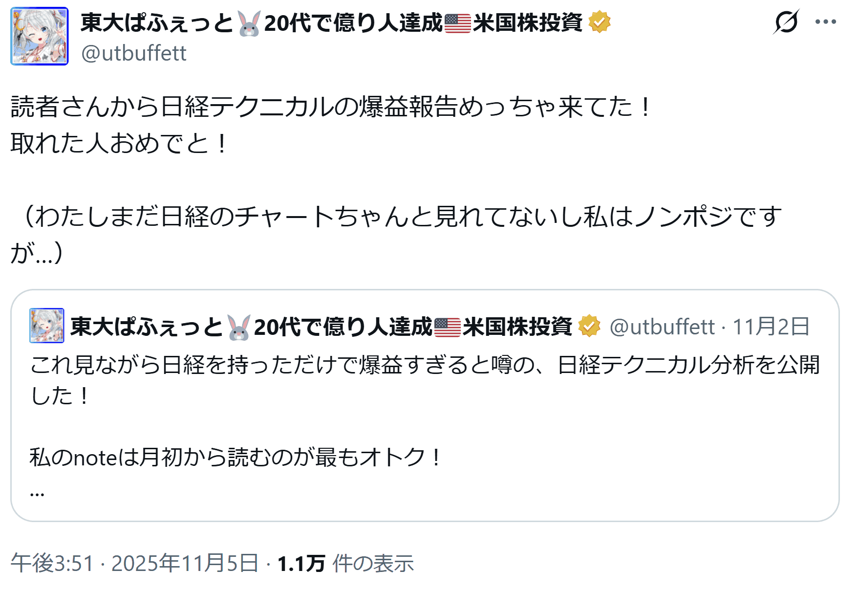 正直、ここに載せているコメントはごく一部です。これだけ多くの読者さんから爆益報告をいただけてることが私が先出しで相場や個別銘柄を当て続けている証左になりますね🐰