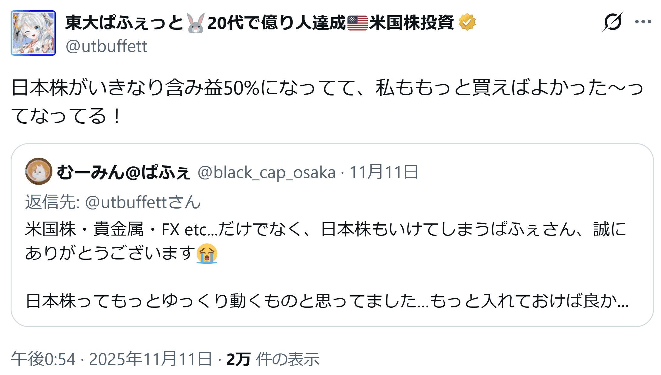 11月の下落で私が相場予測noteに書いて、買いに向かった銘柄の含み益が50%へ!