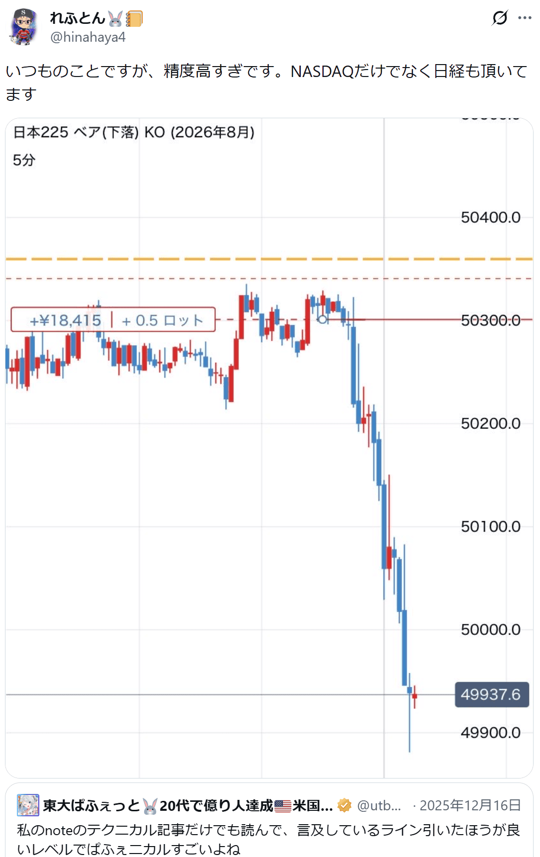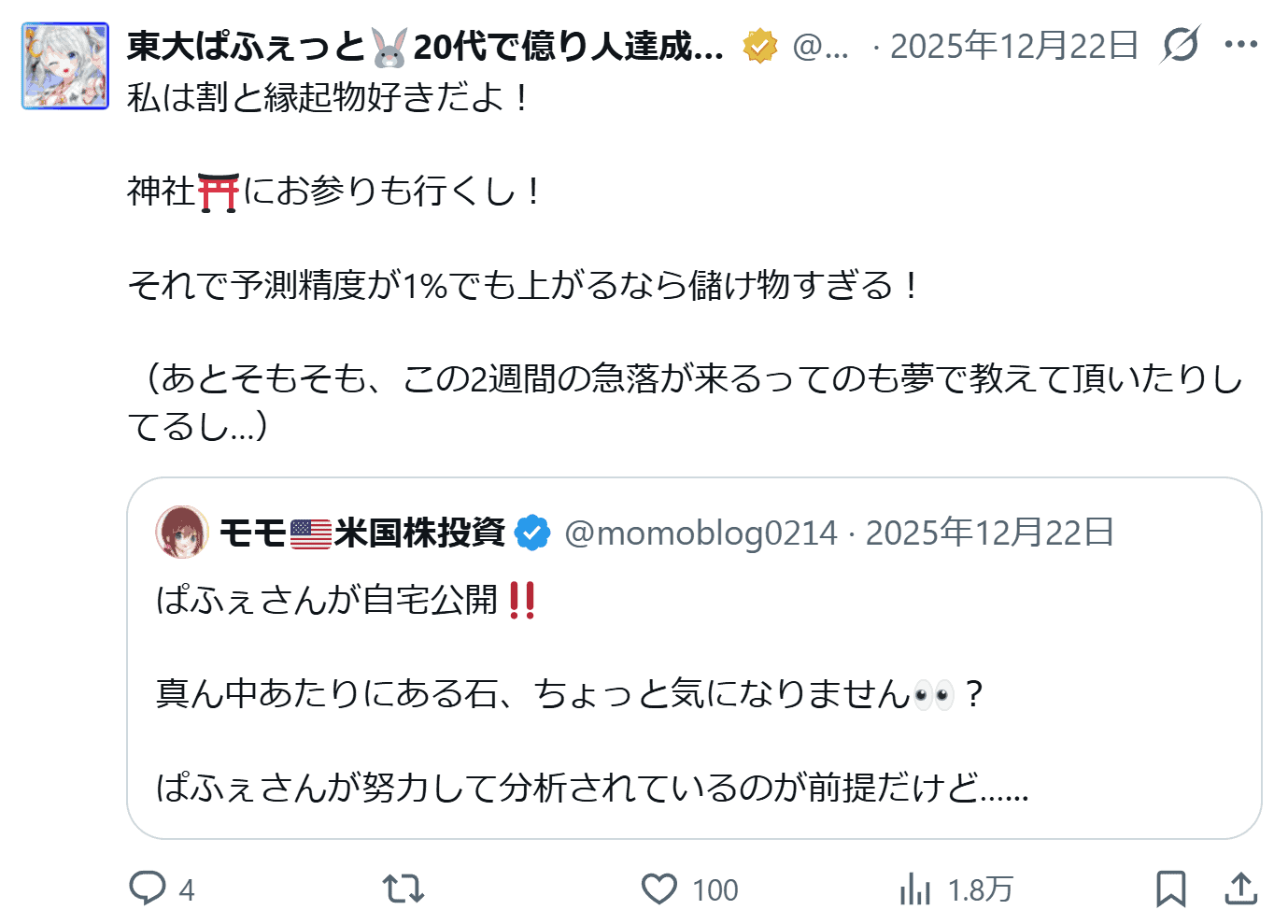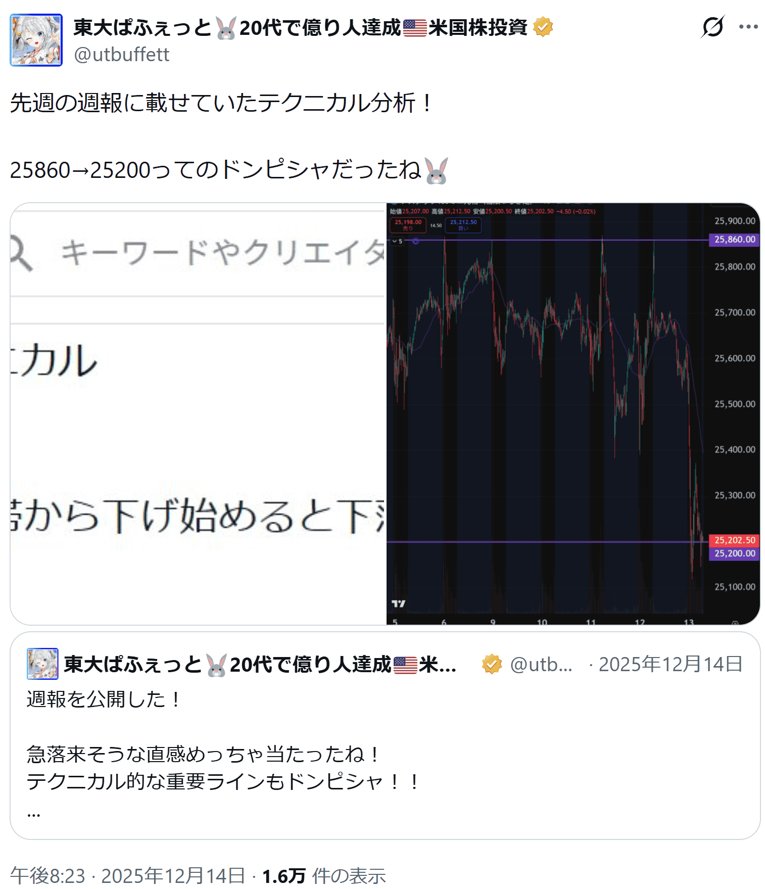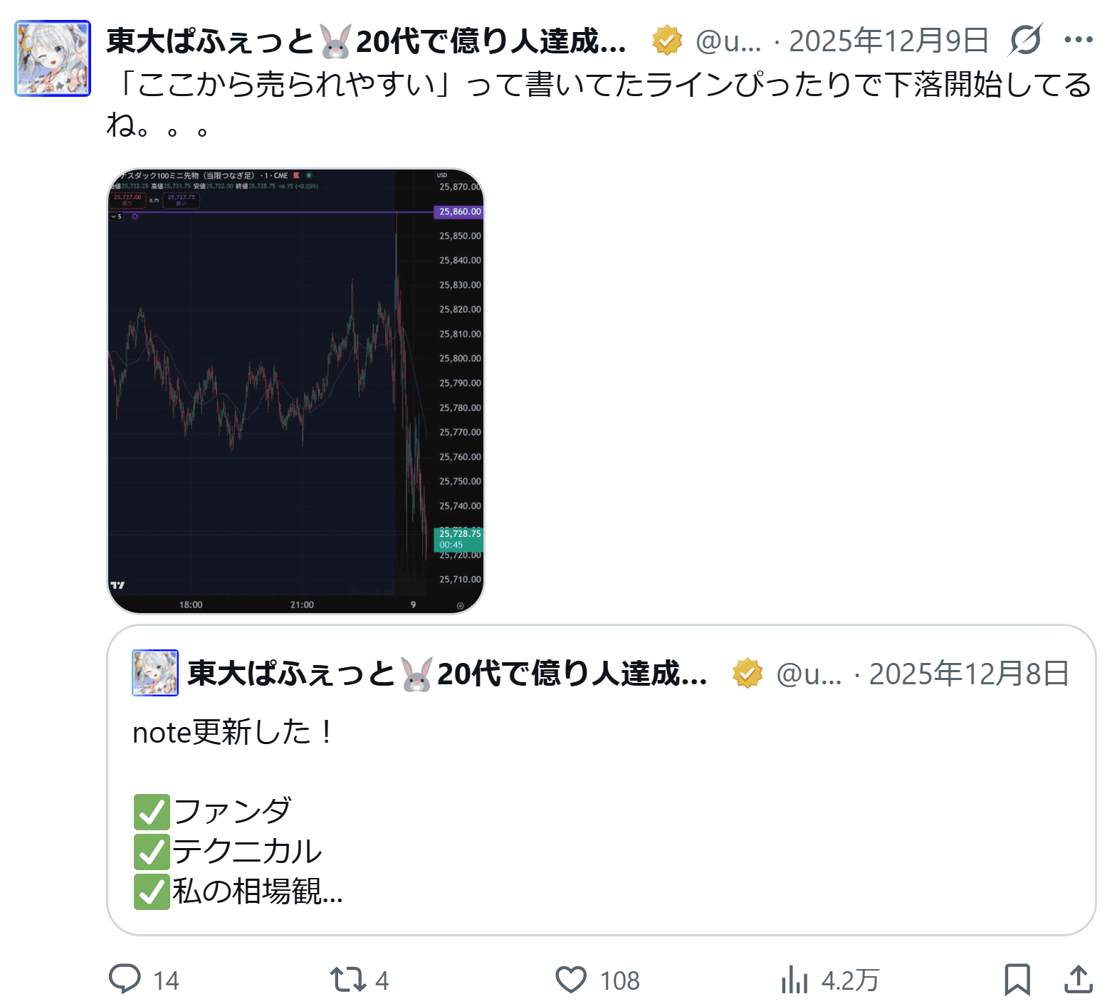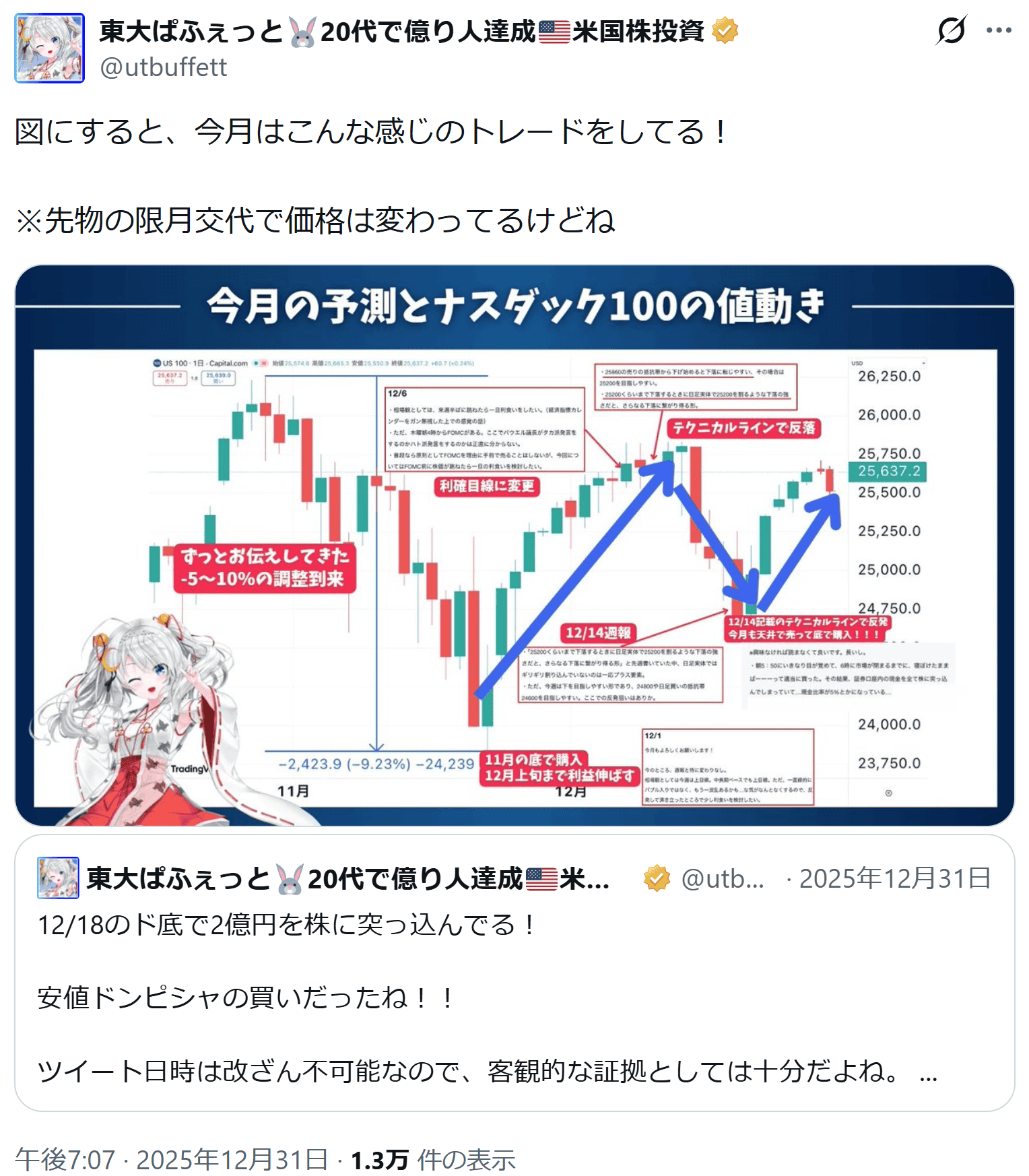 12月の株式市場も爆益でしたね!相場予測noteで紹介していたテクニカル分析(ぱふぇニカル)の精度がすごく良かった🐰