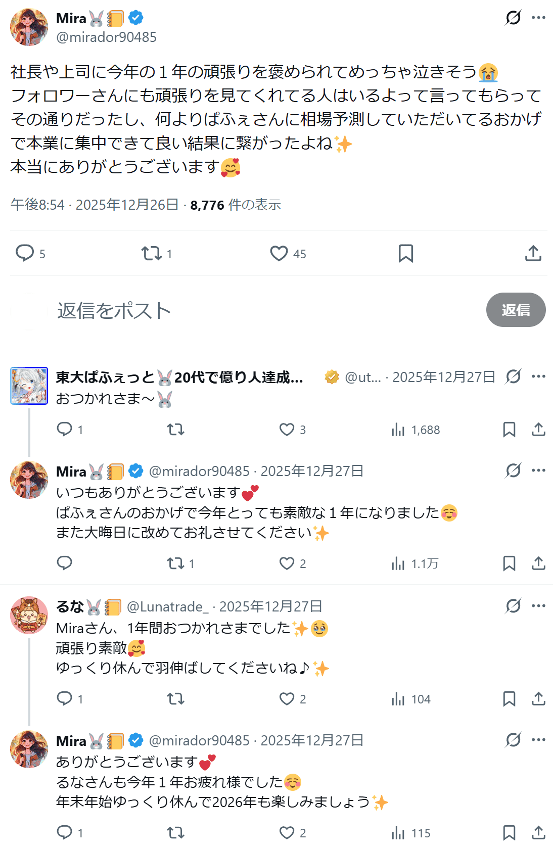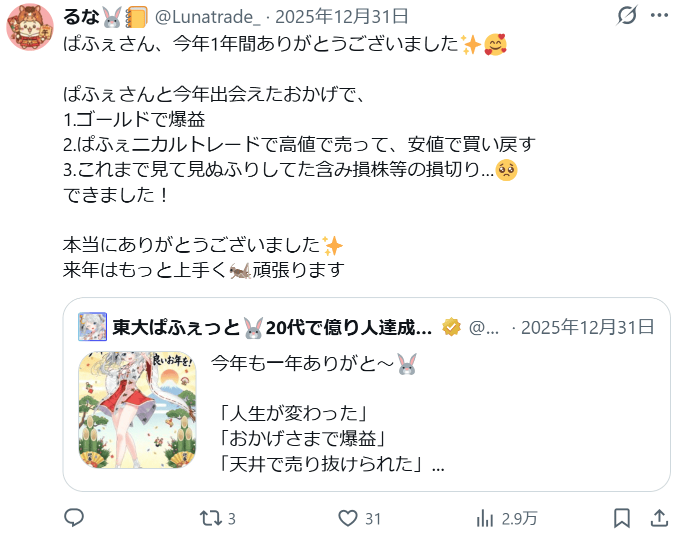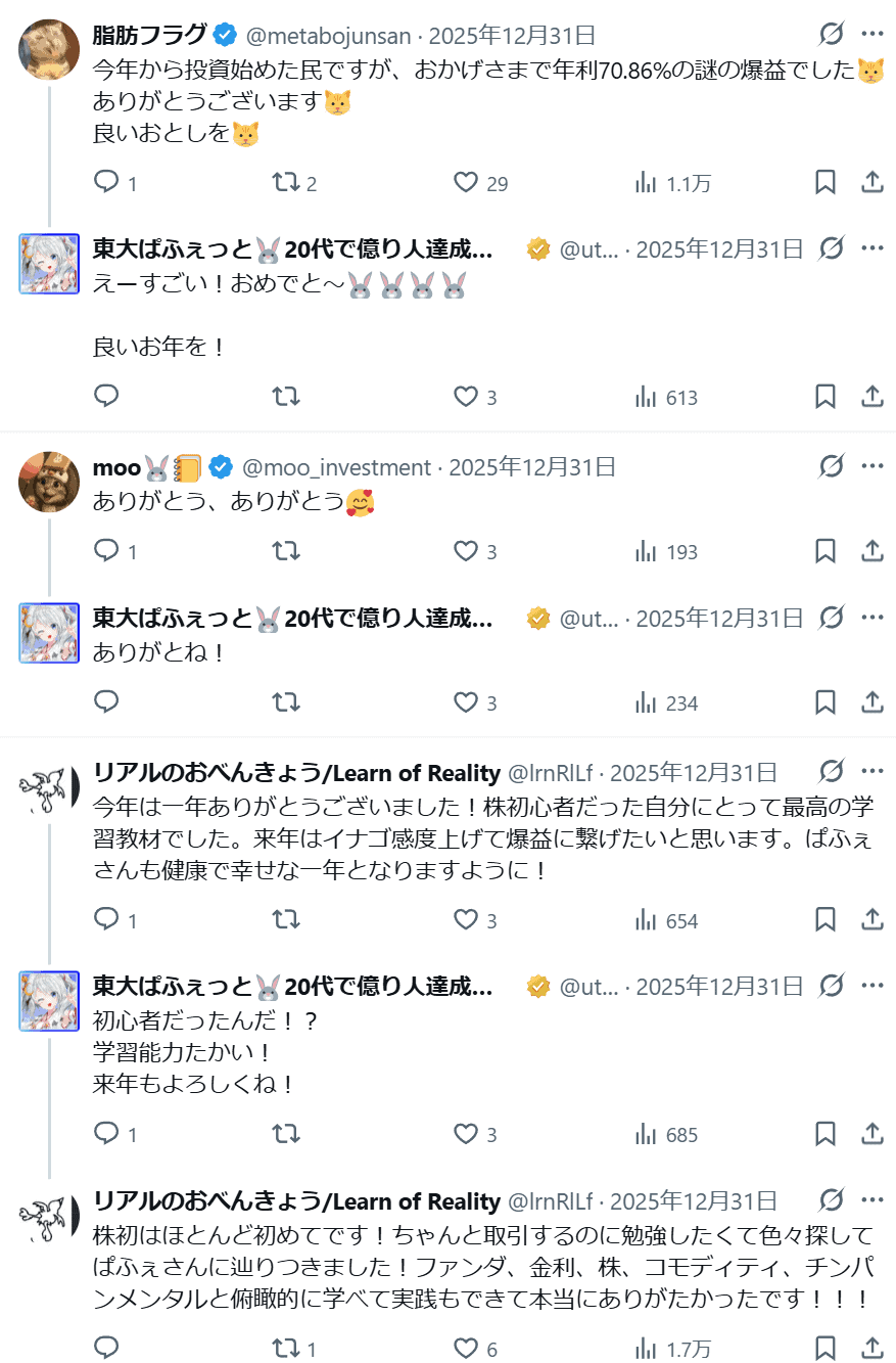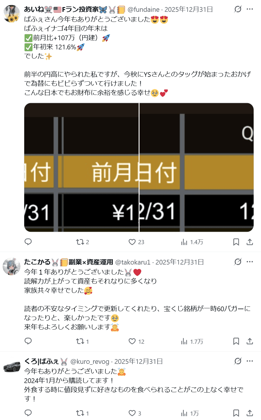 2025年も爆益でしたね!みんなからたくさんの爆益報告をもらって、とっても嬉しいよ!