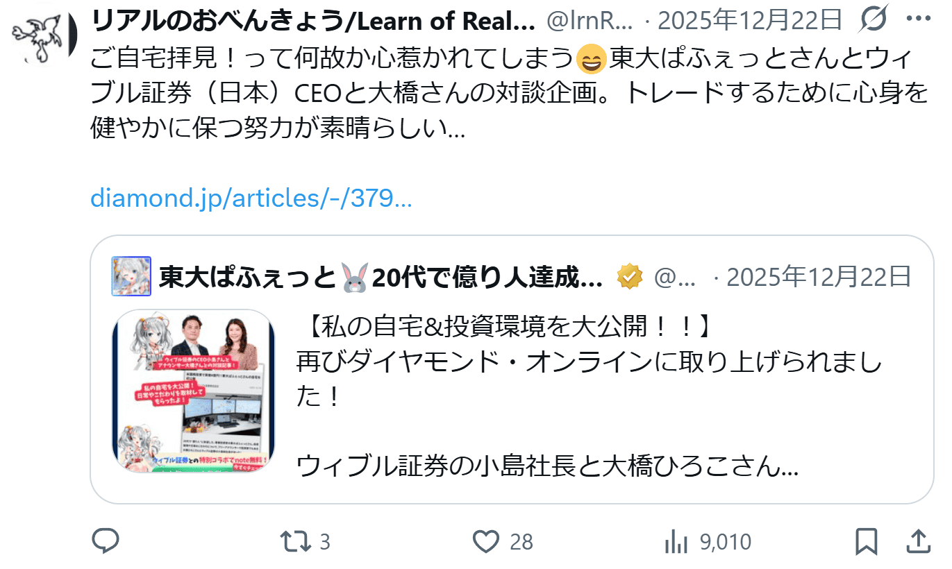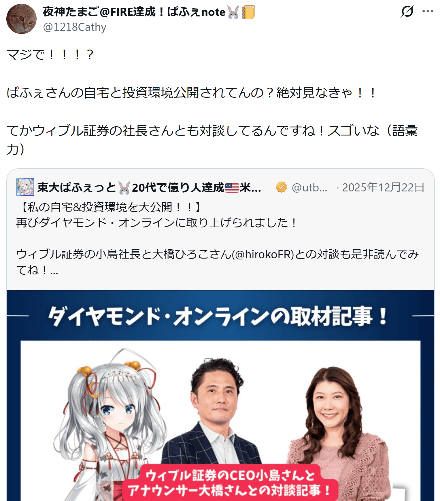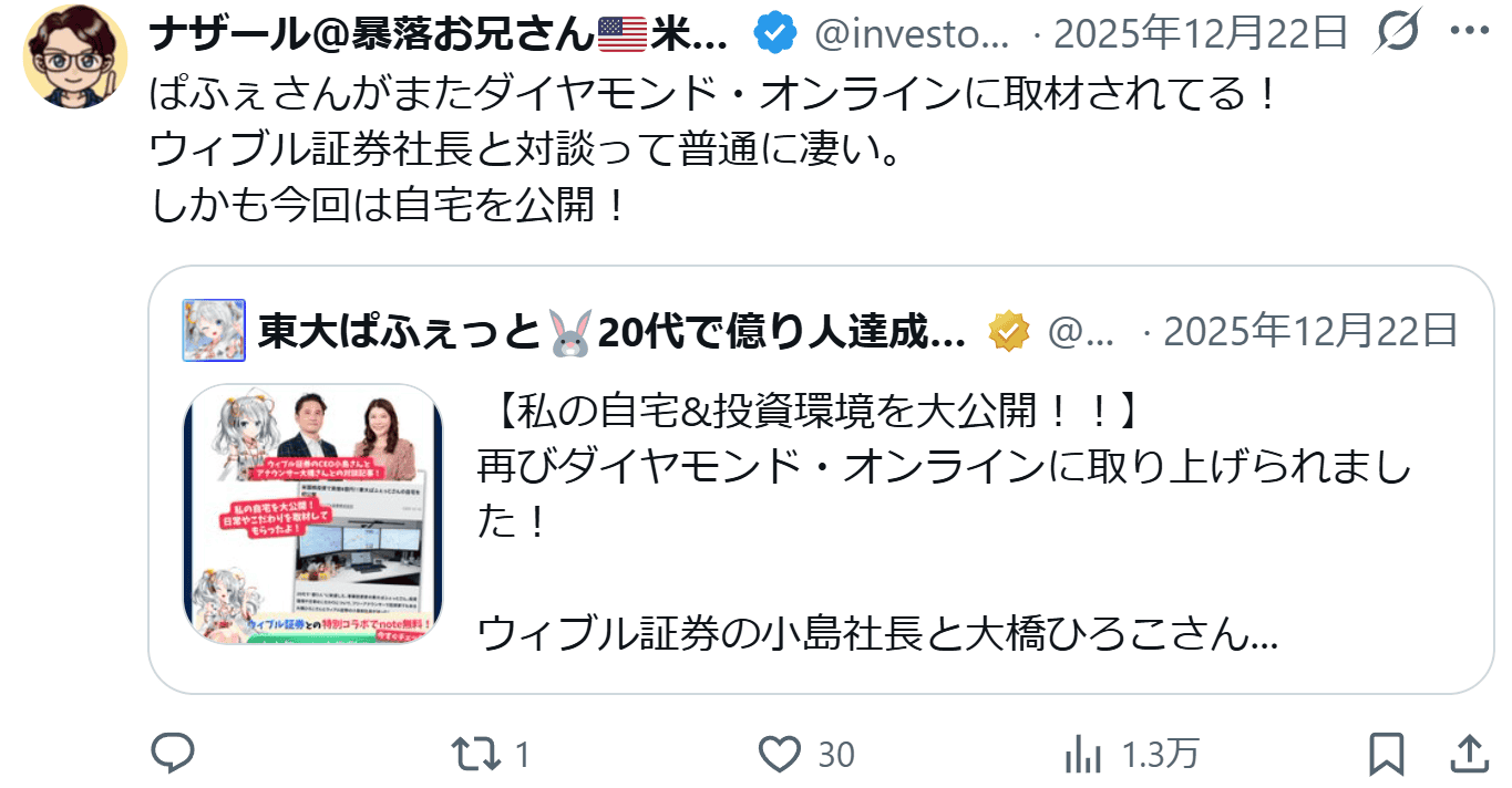 私のメイン口座の1つのウィブル証券さんと対談した記事が公開されています!