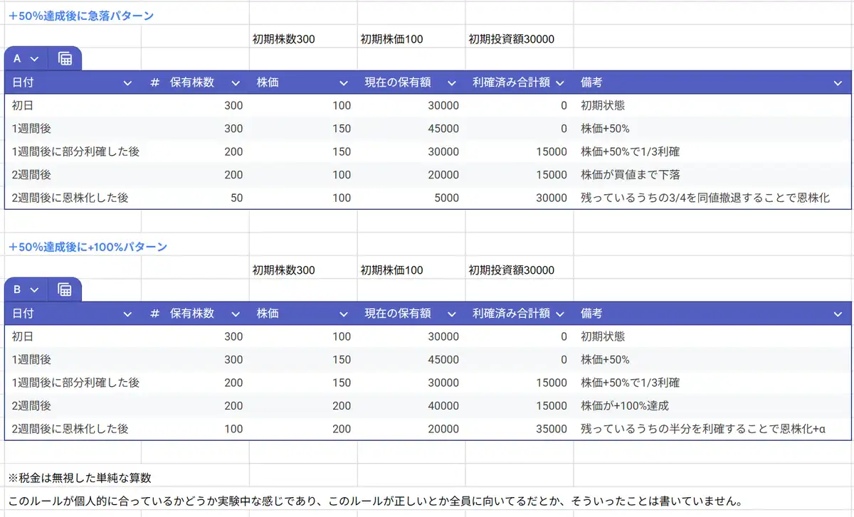 例えば100株+端株30株を買っておいて、+50%辺りで100株を利確したら端株30株は恩株化+αだよね的な。