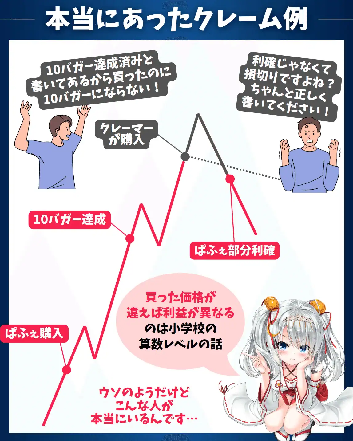 損切りや買い増しの「指示」を求めるモンスタークレーマーもいますが、指示は法律に違反するので一切行いません。投資は全てにおいて自己判断で全てにおいて自己責任です。