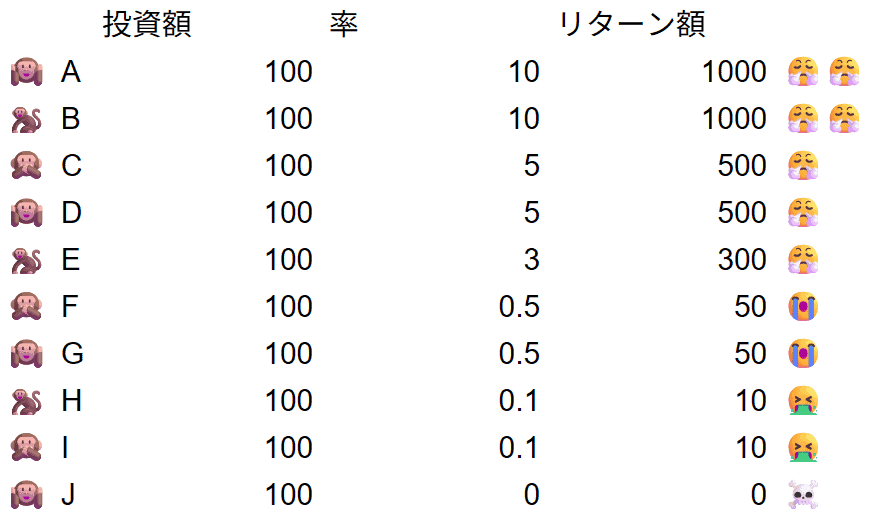 ・チンパンA,B,C,D,Eは生き残る。資産がめっちゃ増えている。こういう爆益チンパンはドヤりまくるので目立つ。
